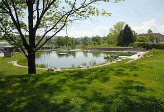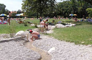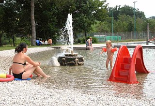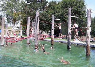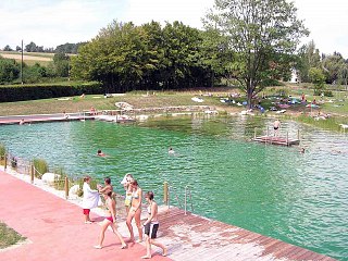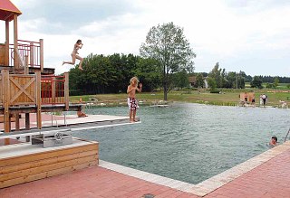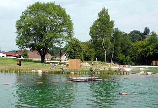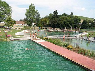 Die Badeanlage besteht aus zwei hydraulisch miteinander verbundenen Wasserflächen. Ein externer Pflanzenfilter sowie ausgedehnte Pflanzbereiche sorgen für einwandfreie Wasserqualität und sorgen für ein natürliches Badeerlebnis.